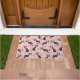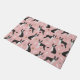 Cute Boston Terrier dogs with black and white coats sit and stand scattered dog bones and paw prints pattern.