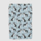 Cute Boston Terrier dogs with black and white coats sit and stand scattered dog bones and paw prints pattern.
