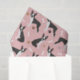 Cute Boston Terrier dogs with black and white coats sit and stand scattered dog bones and paw prints pattern.