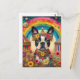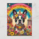 An adorable Boston Terrier in a field of wildflowers with a circus tent in the background wears a unicorn and floral crown AI generated art