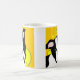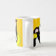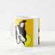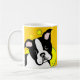 Cute and colourful Boston Terrier art with flat colour and yellow circles on coffee mugs.