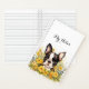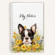 This image showcases a cheerful notebook cover featuring a central illustration of a Boston Terrier surrounded by a lively arrangement of yellow, orange, and blue flowers with lush green leaves. The dog’s expressive eyes and upright ears add personality and charm, while the floral elements create a vibrant, artistic frame. The overall composition feels playful and inviting, blending cuteness with a touch of elegance—perfect for a personalised stationery design.