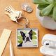 Carry a touch of modern style with this Boston Terrier keychain. Featuring a geometric background, this chic accessory showcases the charm of a Boston Terrier in a compact design. Perfect for dog lovers on the go.