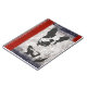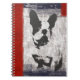 A black and white photo of a boston terrier that has been processed so it has a scratched granite looking surface giving it a retro grunge look. A red textured border gives this creative image a splash of colour.