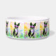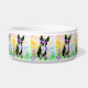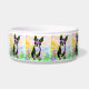 colourful pet bowl with cool boston terrier wearing sunglasses. Art by Amanda Basham