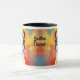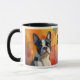 Two sides of this mug for the Boston Terrier fan shows a close up portrait of a little black and white Boston Terrier image against a colourful abstract background. Predominant background colours are orange and yellow, with added tones of blue and red. The text at the centre says "Boston Terrier" but you may easily personalise it or change it to anything else you'd like.