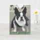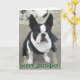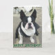 Greetings card featuring a portrait of a Boston Terrier dog. Front text reads "Happy Birthday", inside text reads "Hope you have a great day!" Text can be customised.