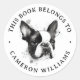 Bookplate labels featuring a black and white watercolor painting of a Boston terrier with splashes and customisable text "this book belongs to" and your name.