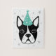 Jigsaw puzzle featuring an illustration of a black and white Boston terrier wearing a turquoise blue party hat surrounded by stars.
