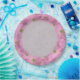 Fully covered with photographic collage of sweet pink garden flowers. Lime green flower centre makes for decorative fresh spots. The main area of this plate is covered with semi transparent white to make the food area a bit tidier.