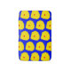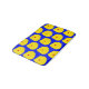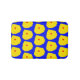 This bath mat shows a simple yet attractive botanical pattern of round yellow leaves and a red centre, on a vibrant blue background.