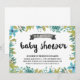 This pretty baby shower invitation features a beautiful blue and green floral wreath border, pretty brush script calligraphy, and a rustic chic chalkboard banner.