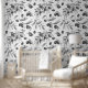 Botanical black and white peel and stick removable vinyl kitchen wallpaper with an elegant chic olive branch sketch illustration.