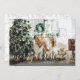 Custom calligraphy photo Merry Christmas cards featuring hand lettered title and watercolor botanicals in brown, purple and gray colors. Easily personalize these photo Christmas cards with your image, family name and text.