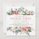 These elegant holiday party invitations feature rustic watercolor flowers with pinecones, branches, berries, leaves, and white roses.