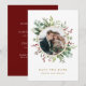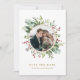 This Christmas | Holiday photo save the date flat card features painted watercolor eucalyptus, green leaves, red berries, pine branches with a faux gold circle frame. For more advanced customisation of this design, please click the "customise further" link. Matching items are also available.