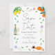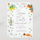 Beautiful modern colourful watercolor wedding save the date invitation with simple boho botanicals, orange and lemon citrus theme ideal for a sunny summer wedding. Original artwork by artist Catherine Sweetman includes foliage, wildflowers, cheese and wine, musical notes and flutes of bubbly. Whimsical handwriting and modern typography script with easy to personalise templates to add names, the date and other essential information along with the bride and grooms initials on the sparkling wine bottle label illustration. Colour palette includes lemon, yellow, orange, green, blue, purple and pink.
