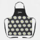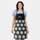 A black apron with a pattern of botanical daisy flower illustration in pastel colours (Leucanthemum vulgare) and a customisable first name above. Daisy is the April birth flower and is symbolic meanings of kindness, purity, innocence, joy and cheerfulness.
