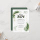 Wild forest themed giraffe, and elegant boys safari animal baby shower invitation featuring a giraffe, an elephant, gold foil and green leaves. Perfect for a boy's baby shower invitations