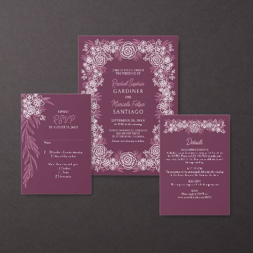 Set the stage for a romantic wedding celebration with this dusty rose, blush pink, and burgundy floral wedding design. The lush profusion of hand-drawn flowers gives this design the romantic, elegant feel found in bespoke stationery. Perfect for a summer garden wedding or a cottagecore wedding. This mix-and-match collection includes three coordinating colorways that you know will work together beautifully. Order your printed invitations and reception supplies or download your digital invitations now for a day they'll never forget!