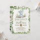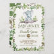 Baby shower invitation featuring illustration of rustic watercolor greens and foliages and an adorable baby elephant