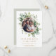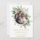 This wedding photo save the date invitation features painted watercolor eucalyptus greenery, green leaves and a gold circle frame. For more advanced customisation of this design, Please click the "Customise further" link. Matching items are also available.
