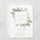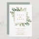 This wedding save the date invitation features painted watercolor eucalyptus greenery, green leaves and a gold square frame. For more advanced customisation of this design, Please click the "Customise further" link. Matching items are also available.