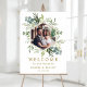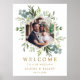 This wedding welcome sign (poster) features painted watercolor eucalyptus, green leaves, and a photo with a faux gold hexagon frame. For more advanced customisation of this design, please click the "Customise further" link. Matching items are also available.