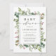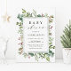 This baby shower invitation features painted watercolor eucalyptus, green leaves, red berries, pine branches, and a green rectangle frame with stylish calligraphy. For more advanced customisation of this design, please click the "Customise further" link. Matching items are also available.
