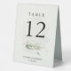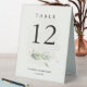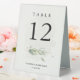 Modern, clean and sophisticated wedding table number tent sign with watercolor greenery foliage leaves illustration.