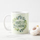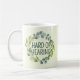 This mug features the slogan 'Hard of Hearing', surrounded by a green wreath of eucalyptus leaves, on a pale green background. You can edit the text as needed.⭐ For more deafness accessories, visit my store Zazzle.com/Elder_Vitality ⭐ For custom orders, message me on Zazzle