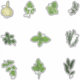 Hand drawn botanical food illustrations of common kitchen garden herbs including rosemary, thyme, bay leaf, garlic, basil, coriander, mint, parsley and sage