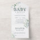 This all in one baby shower invitation card features painted watercolor eucalyptus and green leaves with botanical green letters. For more advanced customisation of this design, please click Customise Further link to change font, size, and colour.