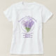 Botanical Provence Fields lavender with text women's T-shirt. Bouquet of lavender with green leaves and stems with purple lavender circle surrounding. Text at top and description of French Provence lavender at bottom in purple text.