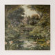 vintage painting of a botanical scene of swans swimming in the water in an English garden with water lilies, bridges and many exotic flowers