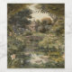 vintage painting of a botanical scene of swans swimming in the water in an English garden with water lilies, bridges and many exotic flowers