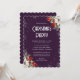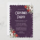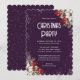 Modern purple Christmas party invitation featuring snowflakes and watercolor painting of poinsettia, holly and red berries.