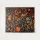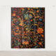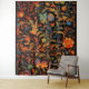 Large scale foliage, and flowers in bright colours of gold, green, red, blue, and purple against a black background. Inspired by historical textiles. Evokes a warm, decadent, bohemian interior.