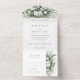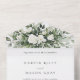 This all-in-one wedding invitation captures the essence of a botanical garden with its elegant floral header, featuring shades of porcelain white and a variety of greens, from mint to sage, enveloping timeless white roses. The invitation is designed for convenience with a tear-away RSVP postcard, seamlessly blending functionality with the delicate beauty of nature. A soft grey background provides a neutral canvas that accentuates the vibrant greens and soft whites of the floral design. Perfect for couples seeking a sophisticated and eco-friendly way to manage their wedding invitations and responses.