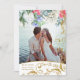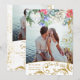 © 2022 Socialite Designs & LICENSORS. An elegant gold and watercolor 2 photos save the date with gorgeous decorative glitter-look botanical swirls and watercolor flowers. Beautiful script calligraphy and watercolor flowers in blue, white, pink, red and green. Faux gold look sprinkles confetti on the back.