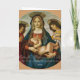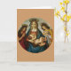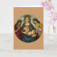 florentine and early renaissance oil painting by sandro botticelli of madonna and child and two saints with golden halos, one is praying, the other is holding a white cloth to his chest. the beautiful madonna dressed in red and blue is holding the baby jesus in her arms and looking straight ahead, her delicate hands and fingers holding the christ in front of her. beautiful and classic fine art painting of nativity with mother and child and saints. round painting in blue, red, and gold. vintage and antique renaissance painting of mother and child.