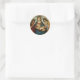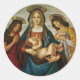 florentine and early renaissance oil painting by sandro  botticelli of madonna and child and two saints with golden halos,  one is praying, the other is holding a white cloth to his chest. the beautiful madonna  dressed in red and blue is holding the  baby jesus in her arms and looking straight ahead, her delicate  hands and fingers holding the christ in front of her. beautiful  and classic fine art painting of nativity with mother and child  and saints. round painting in blue, red, and gold. vintage and  antique renaissance painting of mother and child.