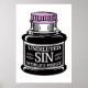 A small vintage bottle, labelled "Undiluted Sin -World's finest". A black and white design with a bit of lilac at the bottle cap. Are you mischievous enough to drink -or to offer it? Anyway, it's guilt-proof, sweet and dirty...