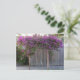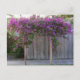 Postcard features a beautiful climbing purple bougainvillea flower escaping over the fence and onto the walk though of an arbor.