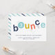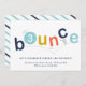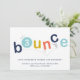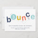 This bounce birthday party invitation features bouncing letters in navy blue, aqua, yellow and orange with the editable age in the O.