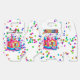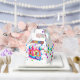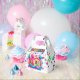 A vibrant and colourful inflatable castle, perfect for a fun-filled birthday party! Predominantly in shades of pink and blue, the castle features charming turrets with flags, battlement-adorned walls, and a bright yellow entrance. A protective net encloses the play area. Set on a flat surface, this whimsical castle brings energy and joy to any celebration.