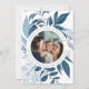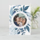 Elegant Hanukkah photo card features a favourite photo surrounded by lush blue botanical foliage and tiny white berries. Personalise with a custom holiday greeting (shown with "wishing you light, peace and love"), and your names curved around the photo. Add four additional images to the back, along with the year.