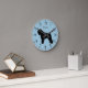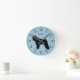 Wonderful black silhouette of a Bouvier des Flanders herding dog. Clock numerals and ticks in black with small dog paw prints at each number. Background is transparent so you can pick a color to match your décor, we chose light blue. Personalize the text with your own easily.