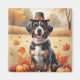A watercolor-style painting of a cheerful dog sitting amidst a pile of vibrant fall leaves, surrounded by tiny pumpkins and scattered acorns. The dog wears a little pilgrim hat and beams with joy, capturing the spirit of Thanksgiving. In the background, soft harvest fields and golden-hued trees create a peaceful countryside ambiance. Gentle textures and warm, muted autumn tones give the scene a cosy, nostalgic feel perfect for celebrating the beauty of the season.