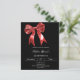 A black background, decorated with a large red bow. Personalise and add a name and party details. White text.